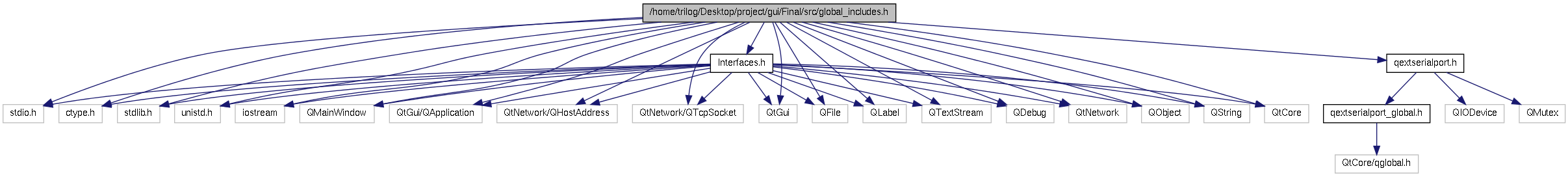 #include <stdio.h>#include <ctype.h>#include <stdlib.h>#include <unistd.h>#include <iostream>#include <QMainWindow>#include <QtGui/QApplication>#include <QtNetwork/QHostAddress>#include <QtNetwork/QTcpSocket>#include <QtGui>#include <QFile>#include <QLabel>#include <QTextStream>#include <QDebug>#include <QtNetwork>#include <QObject>#include <QString>#include <QtCore>#include <qextserialport.h>#include "Interfaces.h"